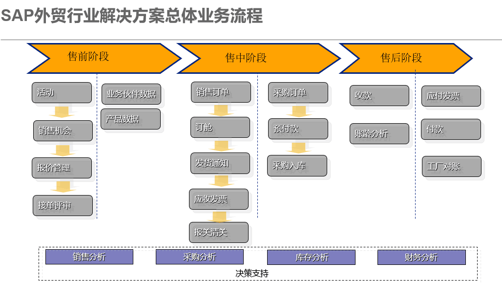 SAP ERP外貿行業軟件解決方案是針對外貿行業業務特征與信息化基礎,為外貿企業量身定制。SAP ERP外貿行業軟件解決方案覆蓋了財務管理、銷售管理、訂單管理、采購管理、庫存管理、配船管理、單證管理、成本管理、客戶管理、樣品管理、質量管理、毛利及經營分析等外貿企業的諸多管理環節,幫助您優化業務流程,很大限度的節省成本,快速作出市場響應,保證企業在不斷變化的市場經濟中持續的盈利能力。