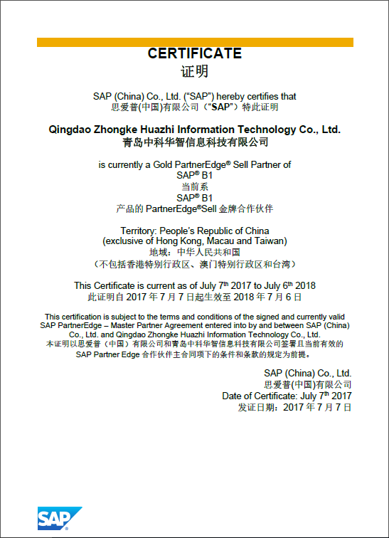 2017年7月,全球知名的ERP軟件提供商德國SAP公司基于中科華智的技術實力、銷售業績、市場覆蓋范圍和客戶服務滿意度調查,通過嚴格的評測后,將青島中科華智信息科技有限公司升級為SAP B1金牌合作伙伴,這是對我們技術實力的認可,是用戶對我們優質服務的贊譽。中科華智作為企業數字化服務整體解決方案服務商,將繼續用專業的技能為客戶提供優質的服務。